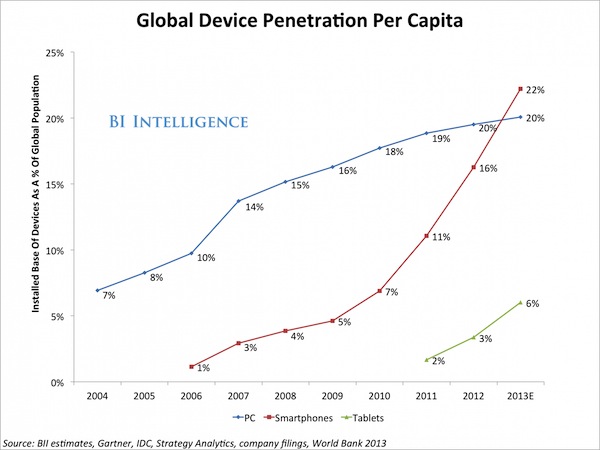 Tất nhiên, đây chỉ là tỉ lệ trung bình, nó không hoàn toàn giống nhau ở mọi quốc gia và chưa chính xác hoàn toàn. Ví dụ, ở nhiều nước thuê bao di động đã đạt đến hơn 100% dân số, và nhiều người có thể có nhiều hơn một điện thoại thông minh. Ngược lại, nhiều người “dùng ké” máy tính bảng, nhưng họ vẫn tự nhận là chủ sở hữu máy tính bảng ngay cả khi họ không mua nó.